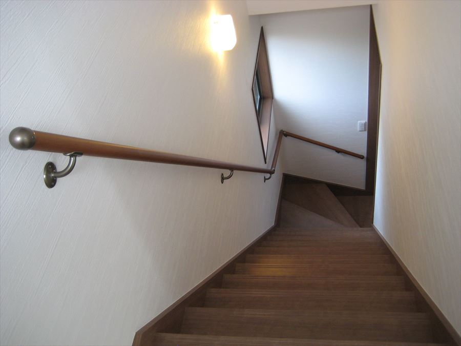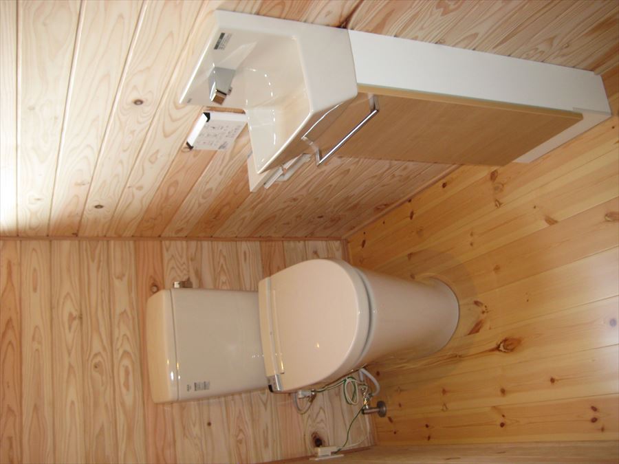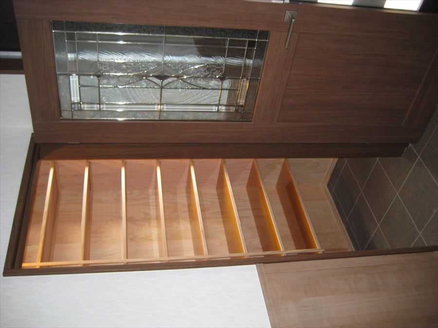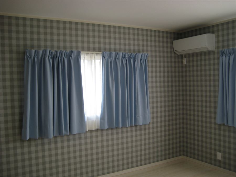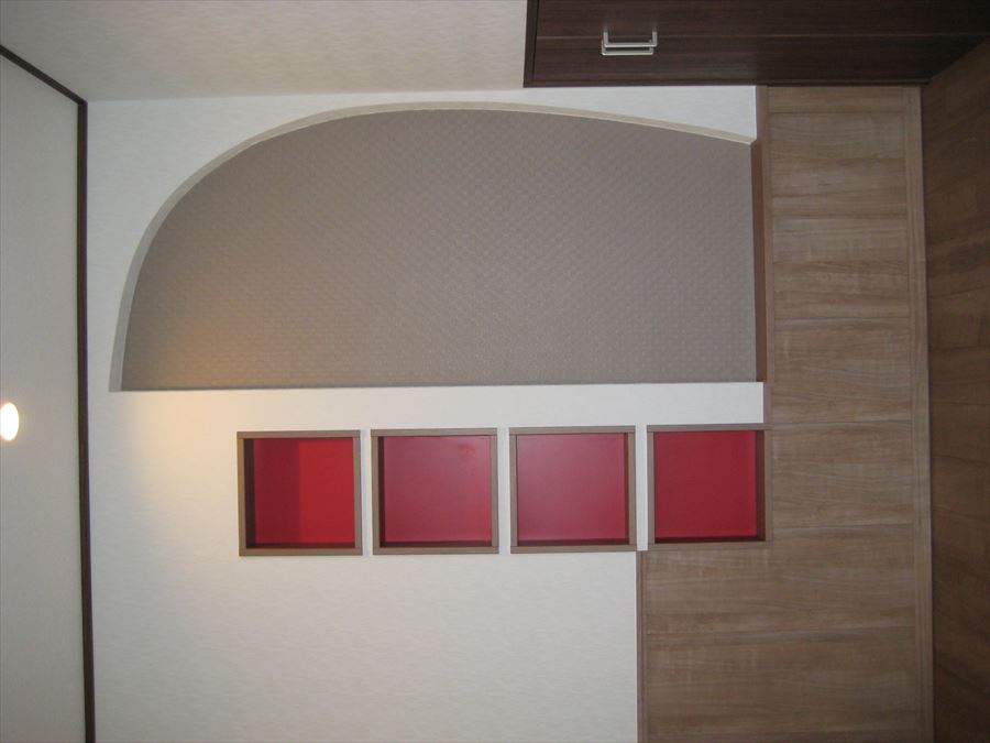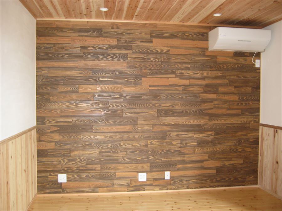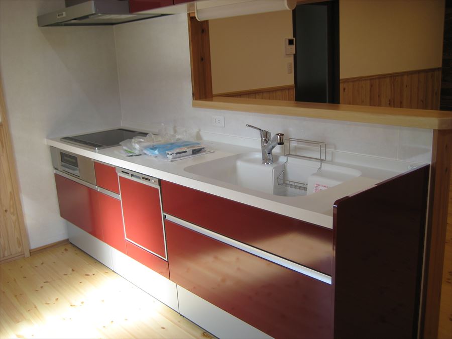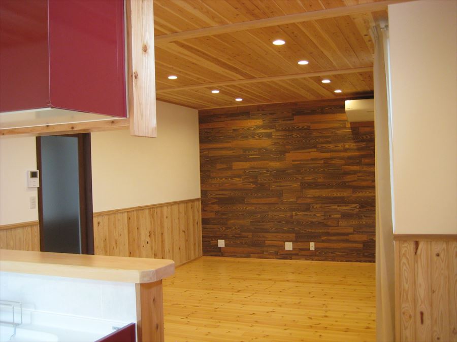 リビングは、人気の木目のデザインで、クロスを使用せず、松板と漆喰を使用してに造り上げた壁は、赤いシステムキッチンが映えるお洒落な空間に。
