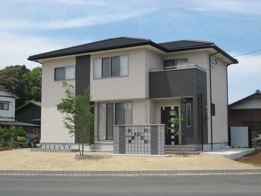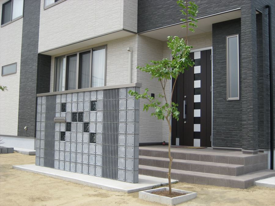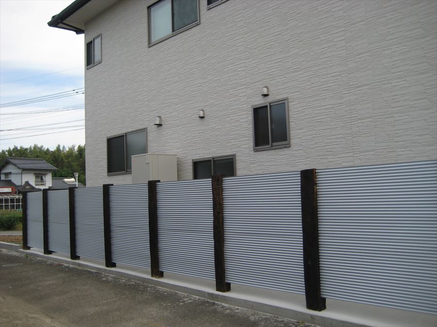 塀は、枕木とガルバリウムの波板を使用した、洋風モダンな家。